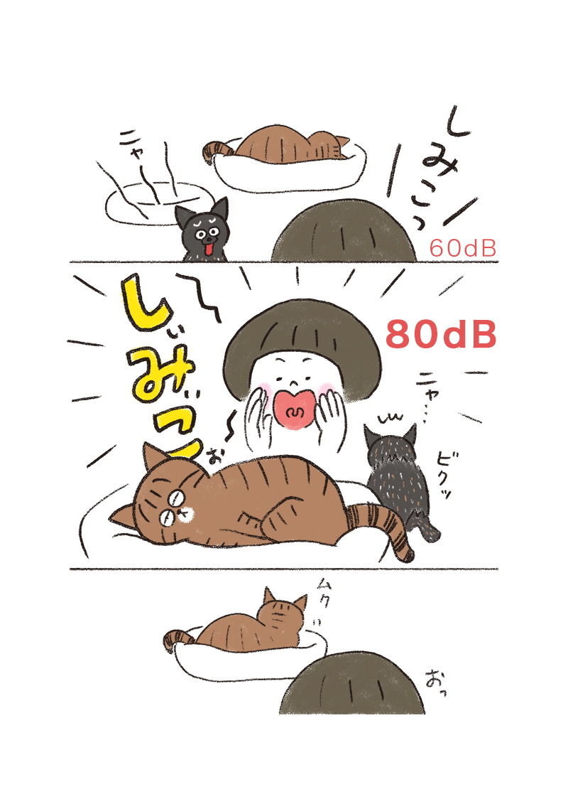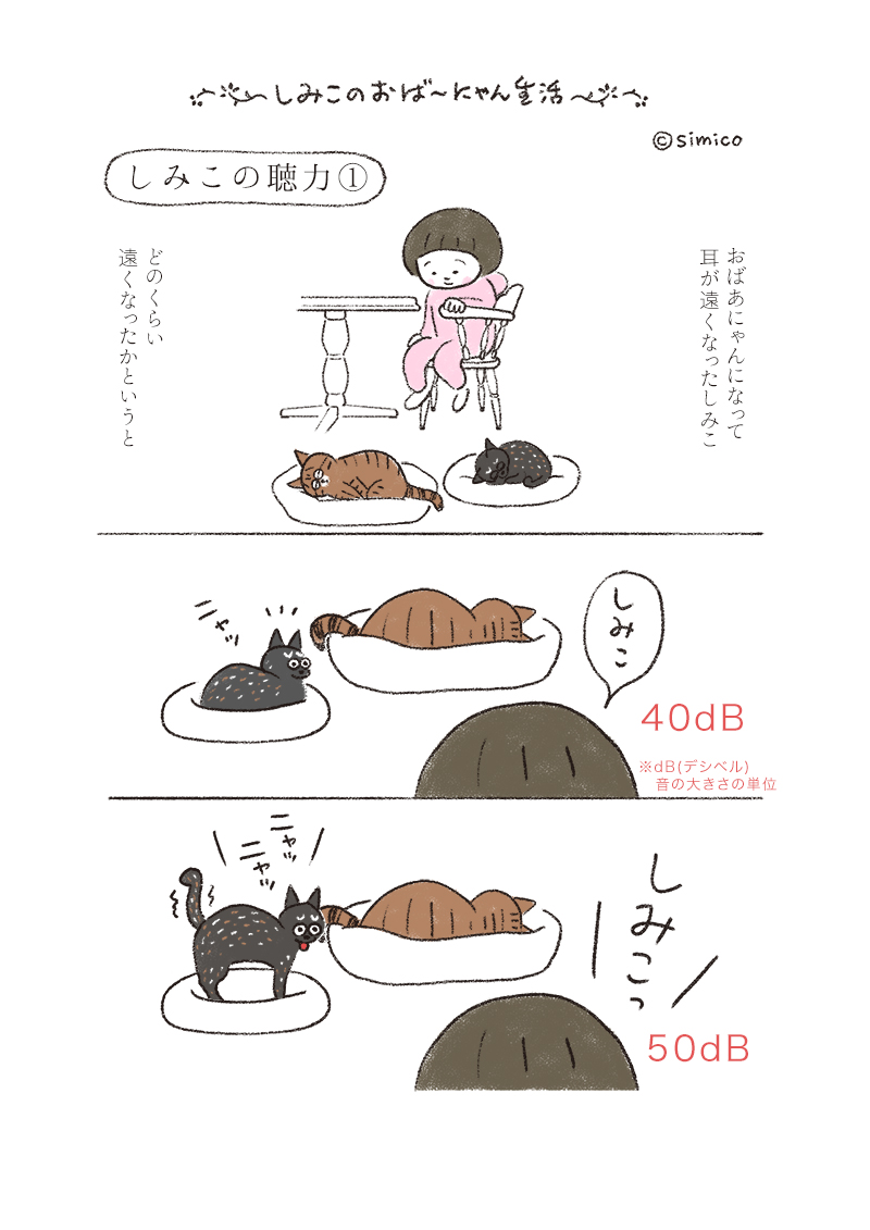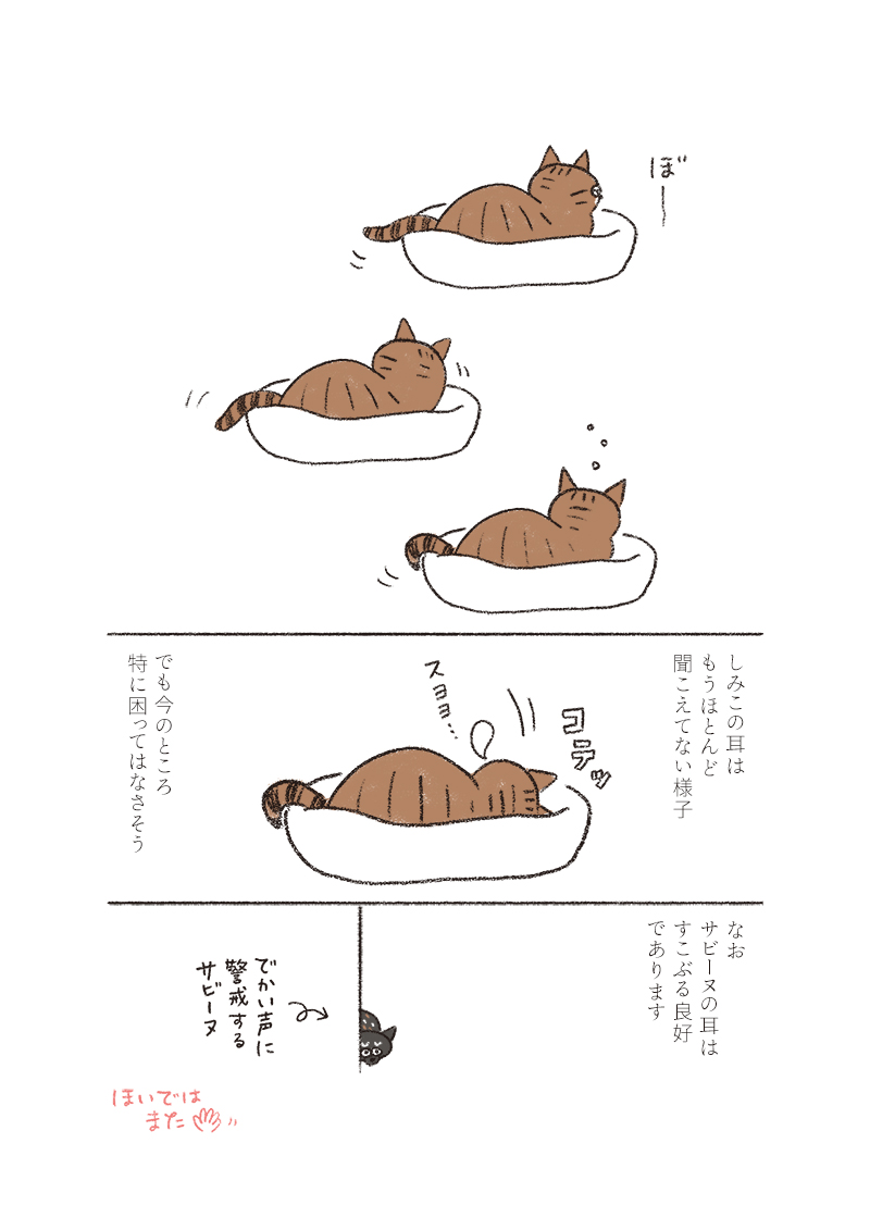 トモヱのほうが先に耳が聞こえていないことが判明していて、漫画に描いたようなやり方で名前を呼んで聴力検査をしたことがありました。その時のしみこはすぐに反応して「ニャンスカ?」って顔をして振り向いていたように思います。
