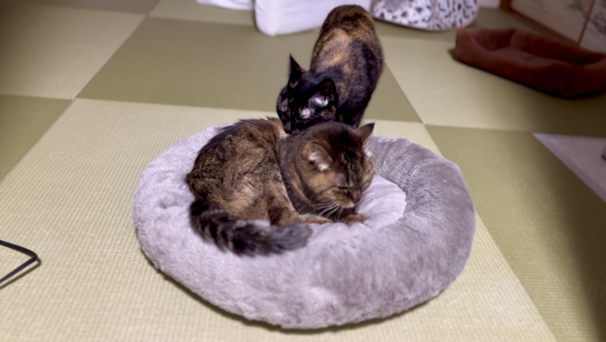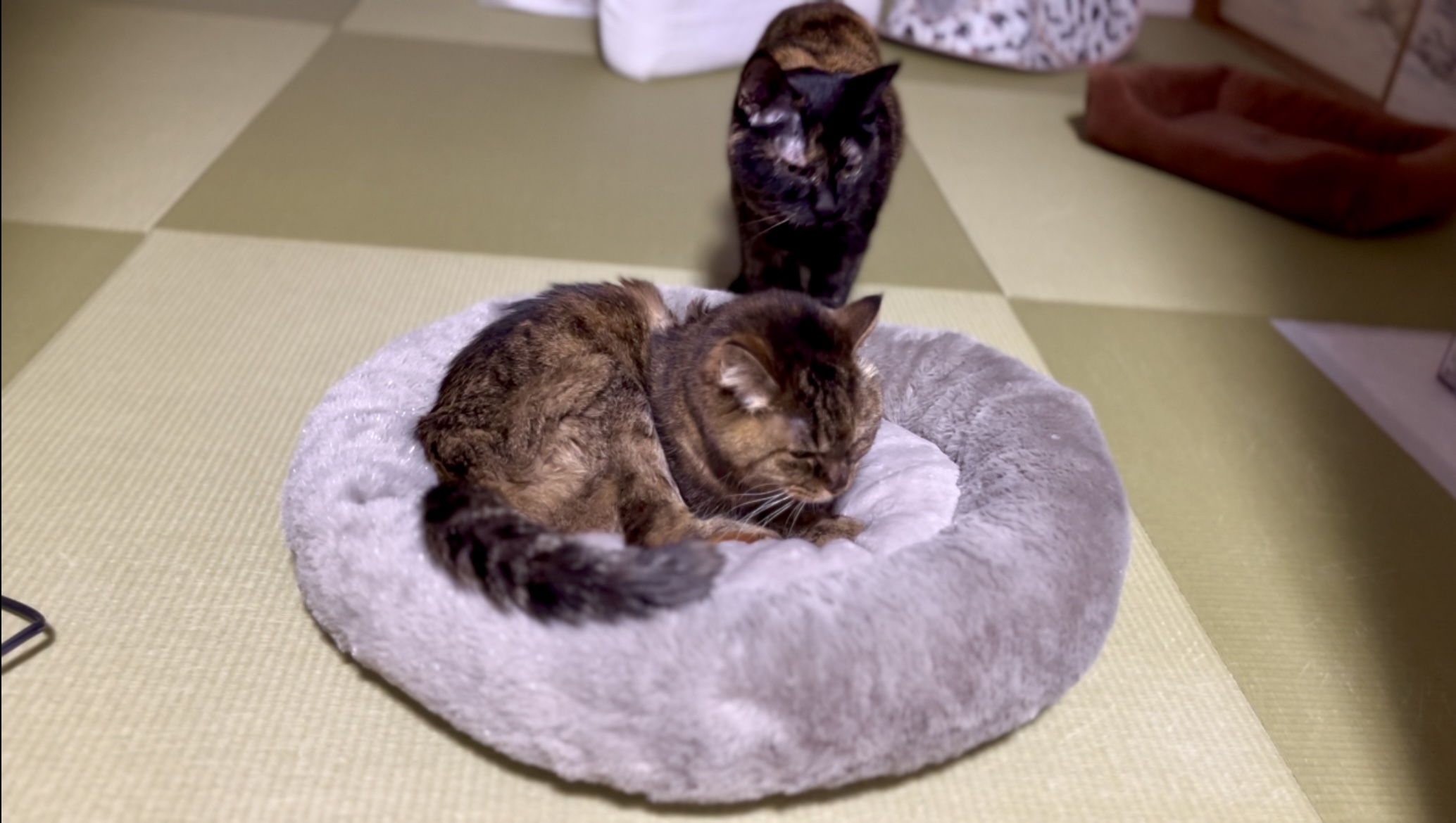 戻ってきたスキにしみこに取られた!(奥に見える茶色いのがいつものコジマのベッド)