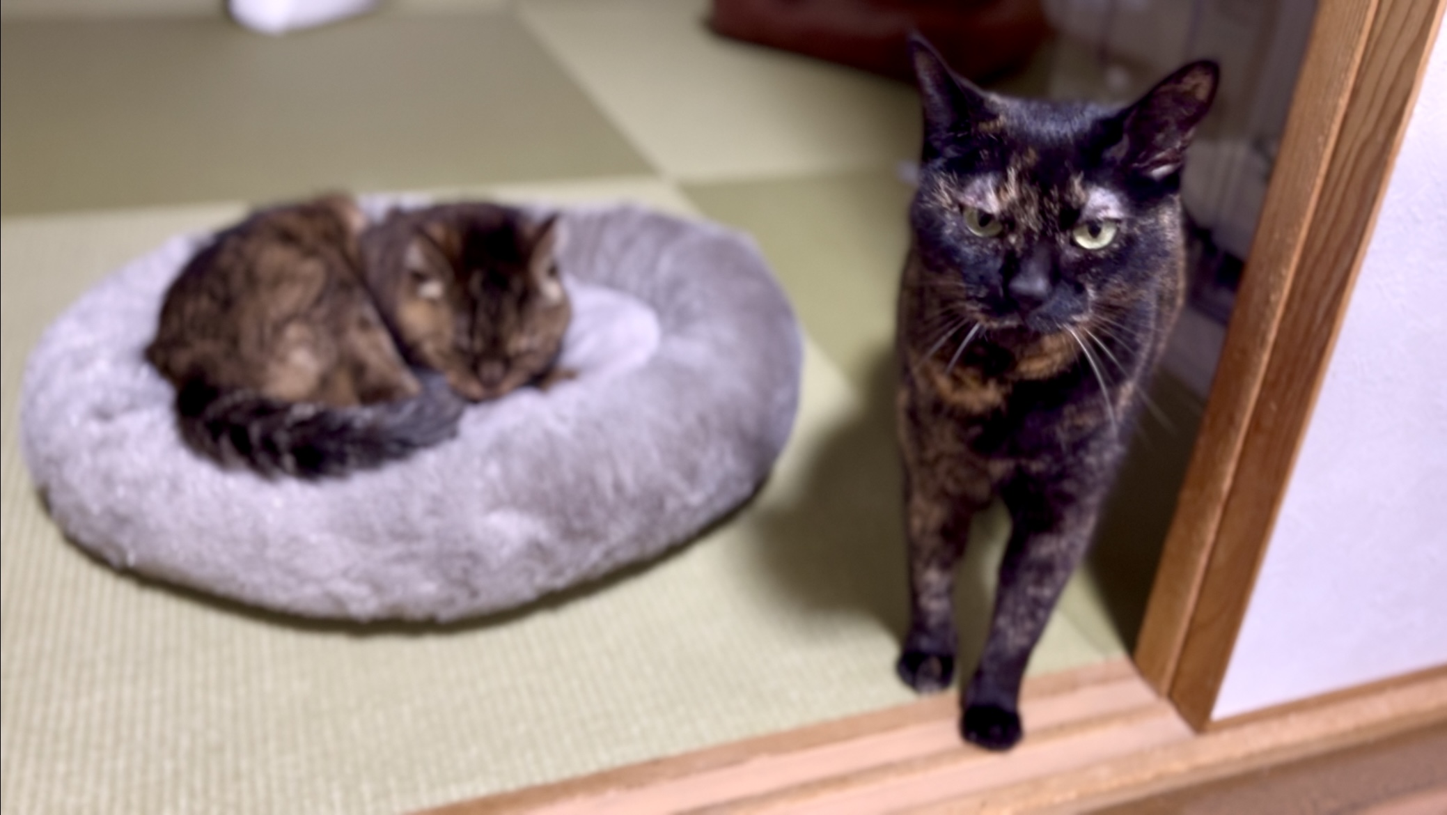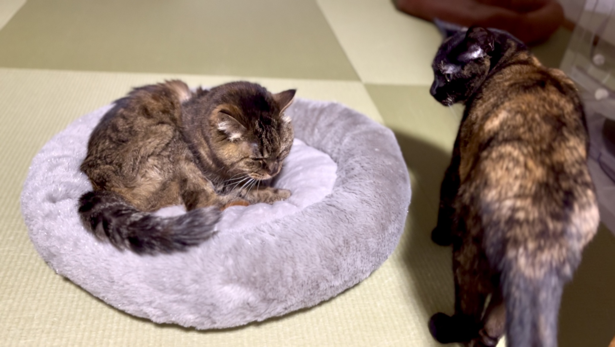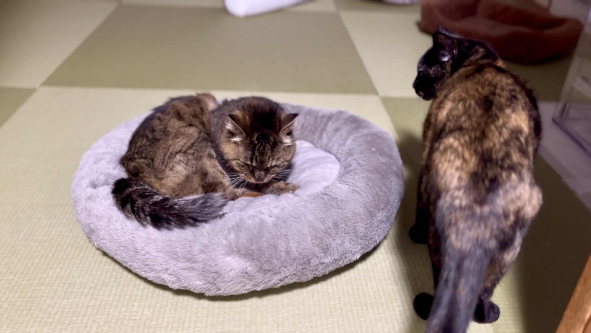 ごはんを食べ終え、戻ってきたサビーヌは、寝ているしみこの周りをじーっと見つめしつこくウロウロしてくやしそうにしていました。